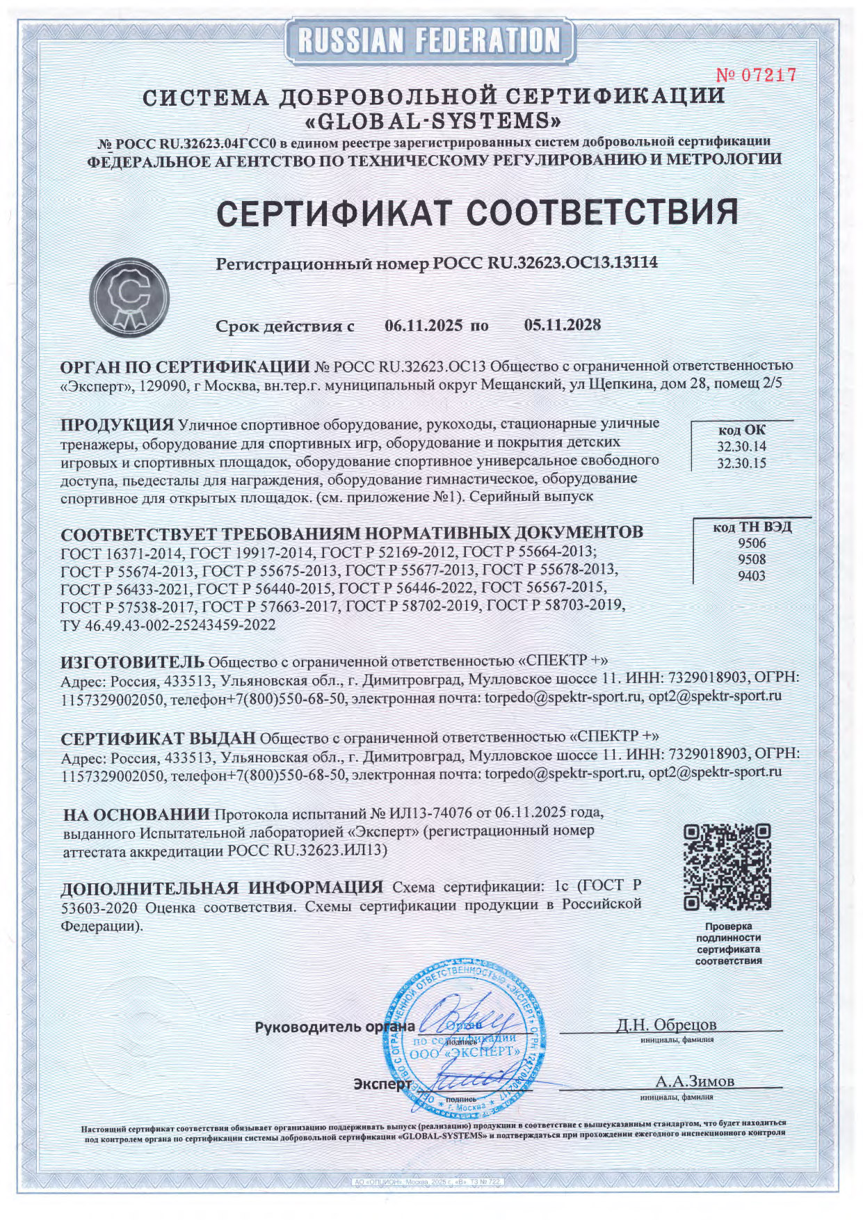 Сертификат соответствия (тренажёры, покрытия)